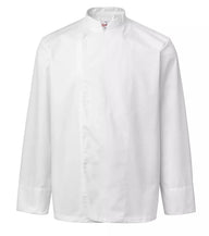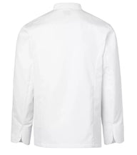 Kokkejakke med skjulte trykknapper. Rett modell med sømmer i ryggen, og hempe i nakken.